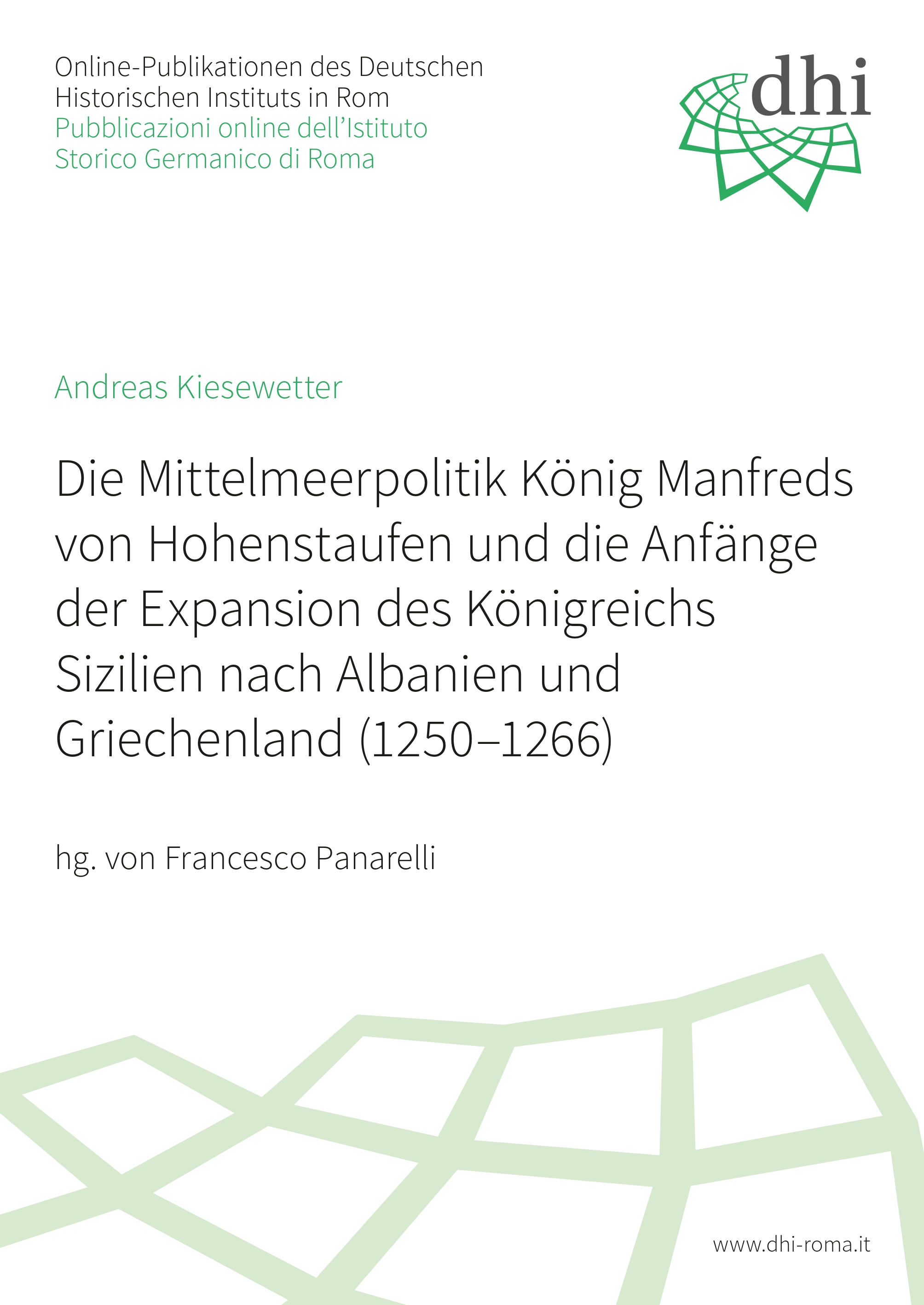 Andreas Kiesewetter, Die Mittelmeerpolitik König Manfreds von Hohenstaufen und die Anfänge der Expansion des Königreichs Sizilien nach Albanien und Griechenland (1250–1266), a cura di Francesco Panarelli, Roma 2026 (Pubblicazioni online dell'Istituto Storico Germanico di Roma [14]), ISBN 978-3-944097-11-4, DOI: https://doi.org/10.25360/01-2026-00001.